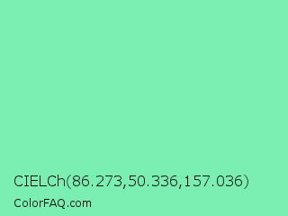 CIELCh 86.273,50.336,157.036 Color is a light green color and the nearest color is Medium Aquamarine #66ddaa. Hex code #7beeb1 and RGB value is rgb(123,238,177). In RGB color space, this color is composed of 48% red, 93% green, 69% blue, In CMYK color space, this color is composed of 48% cyan, 0% magenta, 26% yellow , 7% black , In HSL color space, this color has a hue angle of 148° , 77% saturation and 71% lightness.