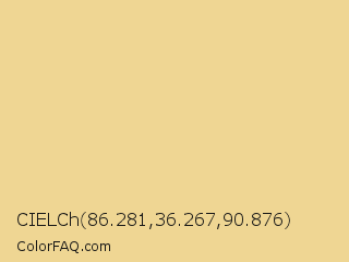 CIELCh 86.281,36.267,90.876 Color is a light orange color and the nearest color is Chalky #eed794. Hex code #efd693 and RGB value is rgb(239,214,147). In RGB color space, this color is composed of 94% red, 84% green, 58% blue, In CMYK color space, this color is composed of 0% cyan, 10% magenta, 38% yellow , 6% black , In HSL color space, this color has a hue angle of 44° , 74% saturation and 76% lightness.