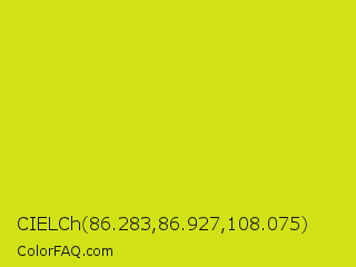 CIELCh 86.283,86.927,108.075 Color is a normal yellow color and the nearest color is Bitter Lemon #cae00d. Hex code #d1e317 and RGB value is rgb(209,227,23). In RGB color space, this color is composed of 82% red, 89% green, 9% blue, In CMYK color space, this color is composed of 8% cyan, 0% magenta, 90% yellow , 11% black , In HSL color space, this color has a hue angle of 65° , 82% saturation and 49% lightness.