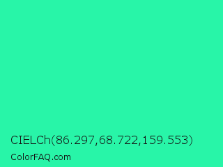 CIELCh 86.297,68.722,159.553 Color is a normal green color and the nearest color is Eucalyptus #44d7a8. Hex code #28f5a8 and RGB value is rgb(40,245,168). In RGB color space, this color is composed of 16% red, 96% green, 66% blue, In CMYK color space, this color is composed of 84% cyan, 0% magenta, 31% yellow , 4% black , In HSL color space, this color has a hue angle of 157° , 91% saturation and 56% lightness.