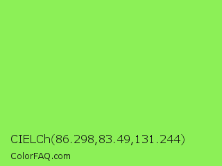 CIELCh 86.298,83.49,131.244 Color is a light green color and the nearest color is Kiwi #8ee53f. Hex code #8cf057 and RGB value is rgb(140,240,87). In RGB color space, this color is composed of 55% red, 94% green, 34% blue, In CMYK color space, this color is composed of 42% cyan, 0% magenta, 64% yellow , 6% black , In HSL color space, this color has a hue angle of 99° , 84% saturation and 64% lightness.