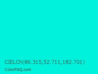 CIELCh 86.315,52.711,182.701 Color is a normal cyan color and the nearest color is Bright Turquoise #08e8de. Hex code #00f2db and RGB value is rgb(0,242,219). In RGB color space, this color is composed of 0% red, 95% green, 86% blue, In CMYK color space, this color is composed of 100% cyan, 0% magenta, 10% yellow , 5% black , In HSL color space, this color has a hue angle of 174° , 100% saturation and 47% lightness.