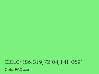 CIELCh 86.319,72.04,141.069 Color is a light green color and the nearest color is Pastel Green #77dd77. Hex code #7bf17e and RGB value is rgb(123,241,126). In RGB color space, this color is composed of 48% red, 95% green, 49% blue, In CMYK color space, this color is composed of 49% cyan, 0% magenta, 48% yellow , 5% black , In HSL color space, this color has a hue angle of 122° , 81% saturation and 71% lightness.