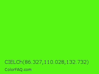 CIELCh 86.327,110.028,132.732 Color is a normal green color and the nearest color is Bright Green #66ff00. Hex code #58f713 and RGB value is rgb(88,247,19). In RGB color space, this color is composed of 35% red, 97% green, 7% blue, In CMYK color space, this color is composed of 64% cyan, 0% magenta, 92% yellow , 3% black , In HSL color space, this color has a hue angle of 102° , 93% saturation and 52% lightness.