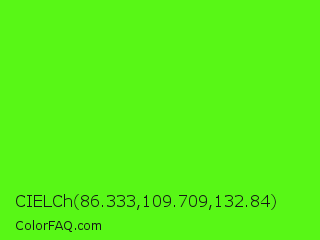 CIELCh 86.333,109.709,132.84 Color is a normal green color and the nearest color is Bright Green #66ff00. Hex code #58f716 and RGB value is rgb(88,247,22). In RGB color space, this color is composed of 35% red, 97% green, 9% blue, In CMYK color space, this color is composed of 64% cyan, 0% magenta, 91% yellow , 3% black , In HSL color space, this color has a hue angle of 102° , 93% saturation and 53% lightness.