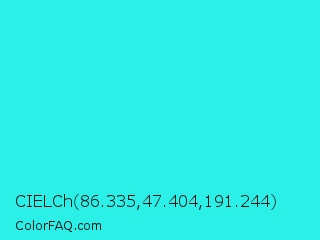 CIELCh 86.335,47.404,191.244 Color is a normal cyan color and the nearest color is Loeen #15f2fd. Hex code #2bf0e8 and RGB value is rgb(43,240,232). In RGB color space, this color is composed of 17% red, 94% green, 91% blue, In CMYK color space, this color is composed of 82% cyan, 0% magenta, 3% yellow , 6% black , In HSL color space, this color has a hue angle of 178° , 87% saturation and 55% lightness.