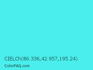 CIELCh 86.336,42.957,195.24 Color is a light cyan color and the nearest color is Turquoise #40e0d0. Hex code #4aeeec and RGB value is rgb(74,238,236). In RGB color space, this color is composed of 29% red, 93% green, 93% blue, In CMYK color space, this color is composed of 69% cyan, 0% magenta, 1% yellow , 7% black , In HSL color space, this color has a hue angle of 179° , 83% saturation and 61% lightness.