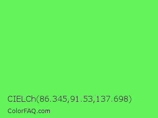 CIELCh 86.345,91.53,137.698 Color is a light green color and the nearest color is Screamin Green #66ff66. Hex code #63f559 and RGB value is rgb(99,245,89). In RGB color space, this color is composed of 39% red, 96% green, 35% blue, In CMYK color space, this color is composed of 60% cyan, 0% magenta, 64% yellow , 4% black , In HSL color space, this color has a hue angle of 116° , 89% saturation and 65% lightness.
