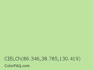 CIELCh 86.346,38.785,130.419 Color is a light green color and the nearest color is Granny Smith Apple #a8e4a0. Hex code #bce49f and RGB value is rgb(188,228,159). In RGB color space, this color is composed of 74% red, 89% green, 62% blue, In CMYK color space, this color is composed of 18% cyan, 0% magenta, 30% yellow , 11% black , In HSL color space, this color has a hue angle of 95° , 56% saturation and 76% lightness.