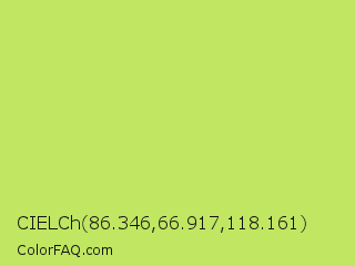 CIELCh 86.346,66.917,118.161 Color is a light lime color and the nearest color is Inchworm #b2ec5d. Hex code #c0e662 and RGB value is rgb(192,230,98). In RGB color space, this color is composed of 75% red, 90% green, 38% blue, In CMYK color space, this color is composed of 17% cyan, 0% magenta, 57% yellow , 10% black , In HSL color space, this color has a hue angle of 77° , 73% saturation and 64% lightness.