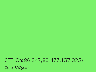 CIELCh 86.347,80.477,137.325 Color is a light green color and the nearest color is Screamin Green #66ff66. Hex code #7af26a and RGB value is rgb(122,242,106). In RGB color space, this color is composed of 48% red, 95% green, 42% blue, In CMYK color space, this color is composed of 50% cyan, 0% magenta, 56% yellow , 5% black , In HSL color space, this color has a hue angle of 113° , 84% saturation and 68% lightness.