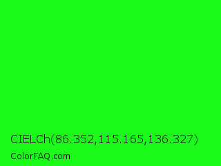 CIELCh 86.352,115.165,136.327 Color is a normal green color and the nearest color is Neon Green #39ff14. Hex code #1cfa1a and RGB value is rgb(28,250,26). In RGB color space, this color is composed of 11% red, 98% green, 10% blue, In CMYK color space, this color is composed of 89% cyan, 0% magenta, 90% yellow , 2% black , In HSL color space, this color has a hue angle of 119° , 96% saturation and 54% lightness.