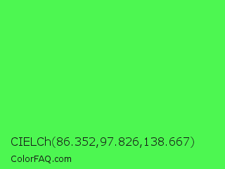 CIELCh 86.352,97.826,138.667 Color is a light green color and the nearest color is Screamin Green #66ff66. Hex code #4df751 and RGB value is rgb(77,247,81). In RGB color space, this color is composed of 30% red, 97% green, 32% blue, In CMYK color space, this color is composed of 69% cyan, 0% magenta, 67% yellow , 3% black , In HSL color space, this color has a hue angle of 121° , 91% saturation and 64% lightness.