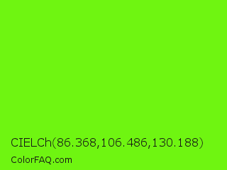 CIELCh 86.368,106.486,130.188 Color is a normal green color and the nearest color is Bright Green #66ff00. Hex code #6ff511 and RGB value is rgb(111,245,17). In RGB color space, this color is composed of 44% red, 96% green, 7% blue, In CMYK color space, this color is composed of 55% cyan, 0% magenta, 93% yellow , 4% black , In HSL color space, this color has a hue angle of 95° , 92% saturation and 51% lightness.