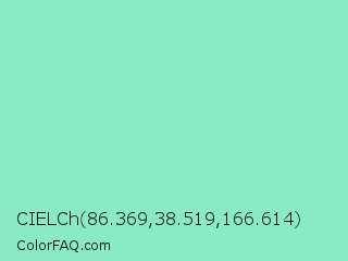 CIELCh 86.369,38.519,166.614 Color is a light green color and the nearest color is Riptide #8be6d8. Hex code #88ebc6 and RGB value is rgb(136,235,198). In RGB color space, this color is composed of 53% red, 92% green, 78% blue, In CMYK color space, this color is composed of 42% cyan, 0% magenta, 16% yellow , 8% black , In HSL color space, this color has a hue angle of 158° , 71% saturation and 73% lightness.