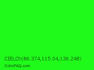 CIELCh 86.374,115.04,136.248 Color is a normal green color and the nearest color is Neon Green #39ff14. Hex code #1ffa1a and RGB value is rgb(31,250,26). In RGB color space, this color is composed of 12% red, 98% green, 10% blue, In CMYK color space, this color is composed of 88% cyan, 0% magenta, 90% yellow , 2% black , In HSL color space, this color has a hue angle of 119° , 96% saturation and 54% lightness.