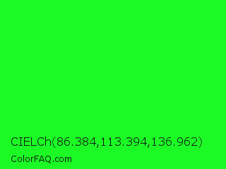 CIELCh 86.384,113.394,136.962 Color is a normal green color and the nearest color is Neon Green #39ff14. Hex code #1cfa26 and RGB value is rgb(28,250,38). In RGB color space, this color is composed of 11% red, 98% green, 15% blue, In CMYK color space, this color is composed of 89% cyan, 0% magenta, 85% yellow , 2% black , In HSL color space, this color has a hue angle of 123° , 96% saturation and 55% lightness.
