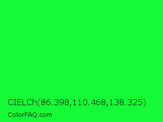 CIELCh 86.398,110.468,138.325 Color is a normal green color and the nearest color is Malachite #0bda51. Hex code #14fa36 and RGB value is rgb(20,250,54). In RGB color space, this color is composed of 8% red, 98% green, 21% blue, In CMYK color space, this color is composed of 92% cyan, 0% magenta, 78% yellow , 2% black , In HSL color space, this color has a hue angle of 129° , 96% saturation and 53% lightness.