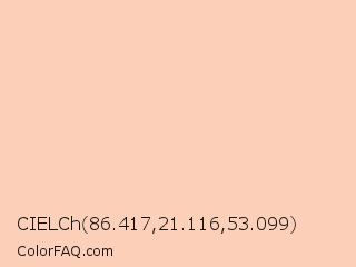 CIELCh 86.417,21.116,53.099 Color is a very light orange color and the nearest color is Romantic #ffd2b7. Hex code #fccfb9 and RGB value is rgb(252,207,185). In RGB color space, this color is composed of 99% red, 81% green, 73% blue, In CMYK color space, this color is composed of 0% cyan, 18% magenta, 27% yellow , 1% black , In HSL color space, this color has a hue angle of 20° , 92% saturation and 86% lightness.