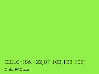 CIELCh 86.422,87.103,128.708 Color is a light green color and the nearest color is Kiwi #8ee53f. Hex code #91f04a and RGB value is rgb(145,240,74). In RGB color space, this color is composed of 57% red, 94% green, 29% blue, In CMYK color space, this color is composed of 40% cyan, 0% magenta, 69% yellow , 6% black , In HSL color space, this color has a hue angle of 94° , 85% saturation and 62% lightness.