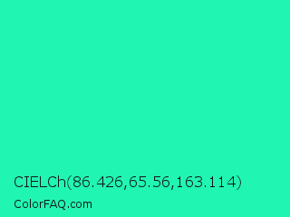 CIELCh 86.426,65.56,163.114 Color is a normal green color and the nearest color is Medium Spring Green #00fa9a. Hex code #21f5b2 and RGB value is rgb(33,245,178). In RGB color space, this color is composed of 13% red, 96% green, 70% blue, In CMYK color space, this color is composed of 87% cyan, 0% magenta, 27% yellow , 4% black , In HSL color space, this color has a hue angle of 161° , 91% saturation and 55% lightness.