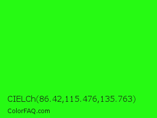 CIELCh 86.42,115.476,135.763 Color is a normal green color and the nearest color is Neon Green #39ff14. Hex code #26fa13 and RGB value is rgb(38,250,19). In RGB color space, this color is composed of 15% red, 98% green, 7% blue, In CMYK color space, this color is composed of 85% cyan, 0% magenta, 92% yellow , 2% black , In HSL color space, this color has a hue angle of 115° , 96% saturation and 53% lightness.