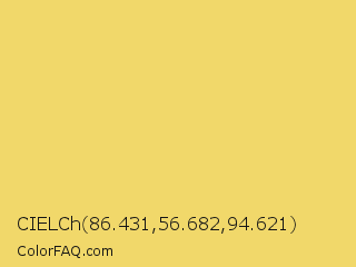 CIELCh 86.431,56.682,94.621 Color is a light yellow color and the nearest color is Orange Yellow #f8d568. Hex code #f1d86a and RGB value is rgb(241,216,106). In RGB color space, this color is composed of 95% red, 85% green, 42% blue, In CMYK color space, this color is composed of 0% cyan, 10% magenta, 56% yellow , 5% black , In HSL color space, this color has a hue angle of 49° , 83% saturation and 68% lightness.
