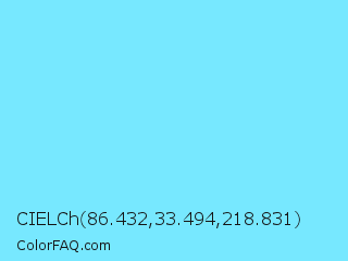 CIELCh 86.432,33.494,218.831 Color is a light cyan color and the nearest color is Electric Blue #7df9ff. Hex code #77e8ff and RGB value is rgb(119,232,255). In RGB color space, this color is composed of 47% red, 91% green, 100% blue, In CMYK color space, this color is composed of 53% cyan, 9% magenta, 0% yellow , 0% black , In HSL color space, this color has a hue angle of 190° , 100% saturation and 73% lightness.