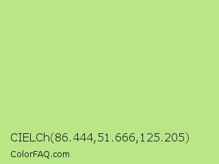 CIELCh 86.444,51.666,125.205 Color is a light green color and the nearest color is Sulu #c1f07c. Hex code #bbe686 and RGB value is rgb(187,230,134). In RGB color space, this color is composed of 73% red, 90% green, 53% blue, In CMYK color space, this color is composed of 19% cyan, 0% magenta, 42% yellow , 10% black , In HSL color space, this color has a hue angle of 87° , 66% saturation and 71% lightness.