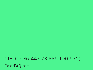CIELCh 86.447,73.889,150.931 Color is a light green color and the nearest color is Very Light Malachite Green #64e986. Hex code #4cf591 and RGB value is rgb(76,245,145). In RGB color space, this color is composed of 30% red, 96% green, 57% blue, In CMYK color space, this color is composed of 69% cyan, 0% magenta, 41% yellow , 4% black , In HSL color space, this color has a hue angle of 144° , 89% saturation and 63% lightness.