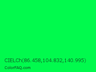 CIELCh 86.458,104.832,140.995 Color is a normal green color and the nearest color is Malachite #0bda51. Hex code #00fa4d and RGB value is rgb(0,250,77). In RGB color space, this color is composed of 0% red, 98% green, 30% blue, In CMYK color space, this color is composed of 100% cyan, 0% magenta, 69% yellow , 2% black , In HSL color space, this color has a hue angle of 138° , 100% saturation and 49% lightness.