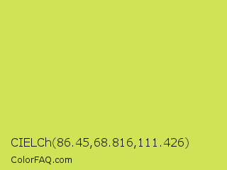 CIELCh 86.45,68.816,111.426 Color is a light yellow color and the nearest color is Maximum Green Yellow #d9e650. Hex code #cfe357 and RGB value is rgb(207,227,87). In RGB color space, this color is composed of 81% red, 89% green, 34% blue, In CMYK color space, this color is composed of 9% cyan, 0% magenta, 62% yellow , 11% black , In HSL color space, this color has a hue angle of 69° , 71% saturation and 62% lightness.