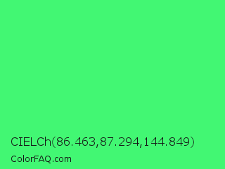 CIELCh 86.463,87.294,144.849 Color is a light green color and the nearest color is Screamin Green #66ff66. Hex code #42f773 and RGB value is rgb(66,247,115). In RGB color space, this color is composed of 26% red, 97% green, 45% blue, In CMYK color space, this color is composed of 73% cyan, 0% magenta, 53% yellow , 3% black , In HSL color space, this color has a hue angle of 136° , 92% saturation and 61% lightness.