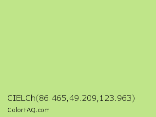 CIELCh 86.465,49.209,123.963 Color is a light green color and the nearest color is Medium Spring Bud #c9dc87. Hex code #bfe589 and RGB value is rgb(191,229,137). In RGB color space, this color is composed of 75% red, 90% green, 54% blue, In CMYK color space, this color is composed of 17% cyan, 0% magenta, 40% yellow , 10% black , In HSL color space, this color has a hue angle of 85° , 64% saturation and 72% lightness.
