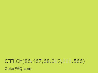 CIELCh 86.467,68.012,111.566 Color is a light yellow color and the nearest color is Maximum Green Yellow #d9e650. Hex code #cfe359 and RGB value is rgb(207,227,89). In RGB color space, this color is composed of 81% red, 89% green, 35% blue, In CMYK color space, this color is composed of 9% cyan, 0% magenta, 61% yellow , 11% black , In HSL color space, this color has a hue angle of 69° , 71% saturation and 62% lightness.
