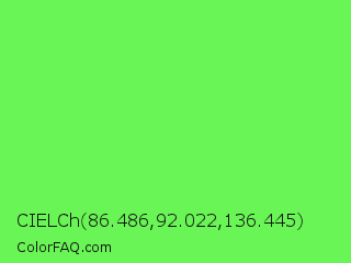 CIELCh 86.486,92.022,136.445 Color is a light green color and the nearest color is Screamin Green #66ff66. Hex code #69f555 and RGB value is rgb(105,245,85). In RGB color space, this color is composed of 41% red, 96% green, 33% blue, In CMYK color space, this color is composed of 57% cyan, 0% magenta, 65% yellow , 4% black , In HSL color space, this color has a hue angle of 113° , 89% saturation and 65% lightness.