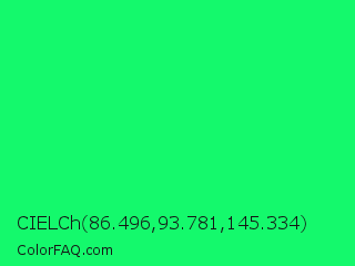 CIELCh 86.496,93.781,145.334 Color is a normal green color and the nearest color is Spring Green #00ff7f. Hex code #14f96c and RGB value is rgb(20,249,108). In RGB color space, this color is composed of 8% red, 98% green, 42% blue, In CMYK color space, this color is composed of 92% cyan, 0% magenta, 57% yellow , 2% black , In HSL color space, this color has a hue angle of 143° , 95% saturation and 53% lightness.