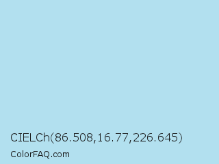 CIELCh 86.508,16.77,226.645 Color is a very light blue color and the nearest color is Blizzard Blue #ace5ee. Hex code #b2e0ef and RGB value is rgb(178,224,239). In RGB color space, this color is composed of 70% red, 88% green, 94% blue, In CMYK color space, this color is composed of 26% cyan, 6% magenta, 0% yellow , 6% black , In HSL color space, this color has a hue angle of 195° , 66% saturation and 82% lightness.