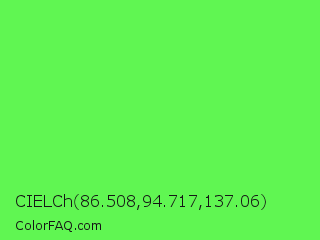 CIELCh 86.508,94.717,137.06 Color is a light green color and the nearest color is Screamin Green #66ff66. Hex code #60f652 and RGB value is rgb(96,246,82). In RGB color space, this color is composed of 38% red, 96% green, 32% blue, In CMYK color space, this color is composed of 61% cyan, 0% magenta, 67% yellow , 4% black , In HSL color space, this color has a hue angle of 115° , 90% saturation and 64% lightness.