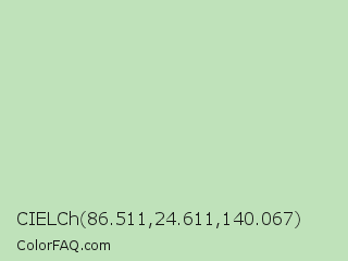 CIELCh 86.511,24.611,140.067 Color is a very light green color and the nearest color is Pixie Green #c0d8b6. Hex code #bfe2ba and RGB value is rgb(191,226,186). In RGB color space, this color is composed of 75% red, 89% green, 73% blue, In CMYK color space, this color is composed of 15% cyan, 0% magenta, 18% yellow , 11% black , In HSL color space, this color has a hue angle of 113° , 41% saturation and 81% lightness.