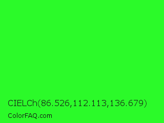 CIELCh 86.526,112.113,136.679 Color is a normal green color and the nearest color is Neon Green #39ff14. Hex code #2bfa29 and RGB value is rgb(43,250,41). In RGB color space, this color is composed of 17% red, 98% green, 16% blue, In CMYK color space, this color is composed of 83% cyan, 0% magenta, 84% yellow , 2% black , In HSL color space, this color has a hue angle of 119° , 95% saturation and 57% lightness.