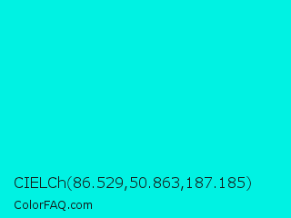 CIELCh 86.529,50.863,187.185 Color is a normal cyan color and the nearest color is Bright Turquoise #08e8de. Hex code #00f2e3 and RGB value is rgb(0,242,227). In RGB color space, this color is composed of 0% red, 95% green, 89% blue, In CMYK color space, this color is composed of 100% cyan, 0% magenta, 6% yellow , 5% black , In HSL color space, this color has a hue angle of 176° , 100% saturation and 47% lightness.