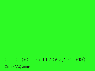 CIELCh 86.535,112.692,136.348 Color is a normal green color and the nearest color is Neon Green #39ff14. Hex code #2dfa25 and RGB value is rgb(45,250,37). In RGB color space, this color is composed of 18% red, 98% green, 15% blue, In CMYK color space, this color is composed of 82% cyan, 0% magenta, 85% yellow , 2% black , In HSL color space, this color has a hue angle of 118° , 96% saturation and 56% lightness.