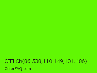CIELCh 86.538,110.149,131.486 Color is a normal green color and the nearest color is Bright Green #66ff00. Hex code #61f703 and RGB value is rgb(97,247,3). In RGB color space, this color is composed of 38% red, 97% green, 1% blue, In CMYK color space, this color is composed of 61% cyan, 0% magenta, 99% yellow , 3% black , In HSL color space, this color has a hue angle of 97° , 98% saturation and 49% lightness.