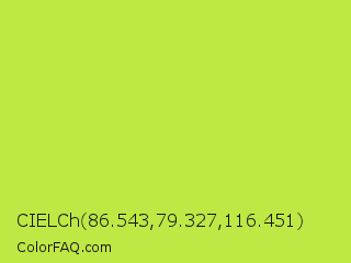 CIELCh 86.543,79.327,116.451 Color is a normal lime color and the nearest color is Conifer #acdd4d. Hex code #bee844 and RGB value is rgb(190,232,68). In RGB color space, this color is composed of 75% red, 91% green, 27% blue, In CMYK color space, this color is composed of 18% cyan, 0% magenta, 71% yellow , 9% black , In HSL color space, this color has a hue angle of 75° , 78% saturation and 59% lightness.