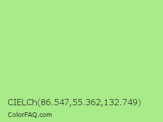 CIELCh 86.547,55.362,132.749 Color is a light green color and the nearest color is Feijoa #9fdd8c. Hex code #a9ea89 and RGB value is rgb(169,234,137). In RGB color space, this color is composed of 66% red, 92% green, 54% blue, In CMYK color space, this color is composed of 28% cyan, 0% magenta, 41% yellow , 8% black , In HSL color space, this color has a hue angle of 100° , 70% saturation and 73% lightness.