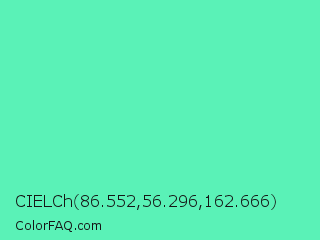 CIELCh 86.552,56.296,162.666 Color is a light green color and the nearest color is Medium Aquamarine #66ddaa. Hex code #5af2b7 and RGB value is rgb(90,242,183). In RGB color space, this color is composed of 35% red, 95% green, 72% blue, In CMYK color space, this color is composed of 63% cyan, 0% magenta, 24% yellow , 5% black , In HSL color space, this color has a hue angle of 157° , 85% saturation and 65% lightness.