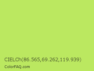 CIELCh 86.565,69.262,119.939 Color is a light green color and the nearest color is Inchworm #b2ec5d. Hex code #bbe860 and RGB value is rgb(187,232,96). In RGB color space, this color is composed of 73% red, 91% green, 38% blue, In CMYK color space, this color is composed of 19% cyan, 0% magenta, 59% yellow , 9% black , In HSL color space, this color has a hue angle of 80° , 75% saturation and 64% lightness.