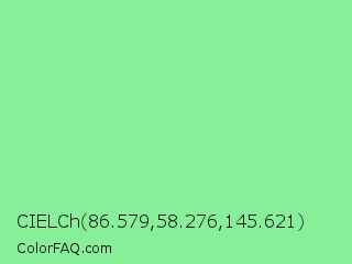 CIELCh 86.579,58.276,145.621 Color is a light green color and the nearest color is Light Green #90ee90. Hex code #87ef98 and RGB value is rgb(135,239,152). In RGB color space, this color is composed of 53% red, 94% green, 60% blue, In CMYK color space, this color is composed of 44% cyan, 0% magenta, 36% yellow , 6% black , In HSL color space, this color has a hue angle of 130° , 76% saturation and 73% lightness.