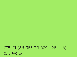 CIELCh 86.588,73.629,128.116 Color is a light green color and the nearest color is Inchworm #b2ec5d. Hex code #a2ed64 and RGB value is rgb(162,237,100). In RGB color space, this color is composed of 64% red, 93% green, 39% blue, In CMYK color space, this color is composed of 32% cyan, 0% magenta, 58% yellow , 7% black , In HSL color space, this color has a hue angle of 93° , 79% saturation and 66% lightness.